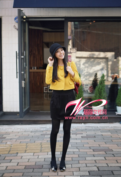 黄色短款小外套,亮丽的色彩与秀气的款式俏丽又可爱,搭配黑色半身裙,带来活泼的新美感!