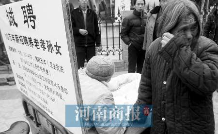昨日上午,郑州市紫荆山路与金水路交叉口附近,一个穿着蓝棉袄的老人骑着三轮车,带着一位白发苍苍的老人。三轮车上竖了一个“诚聘孝顺孙女”的广告牌。上面写,想招聘30~45岁之间的女性,聘期5年(卫生执法部门当权者优先考虑)。