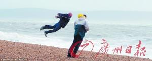 海边的行人被刮起脱离地面,“飘在半空中”。