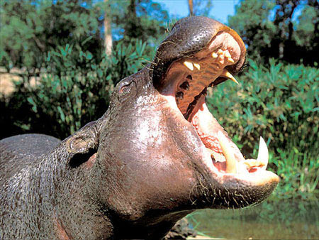 那只大河马看了我有3秒钟,认定我不友好,一个高声吼叫,突然四头河马都在水中扬起头,都将头对着我的船的方向。我惟一的方法只能是快划船逃开,我拼命划浆!里克在我后面。后来他说他从没有看到什么人打浆如此快,最后我还是冲回到了河中间,当我抬头看时,那四头河马仍然在用一种厌恶的眼光看着我。然后它们消失在河水里。