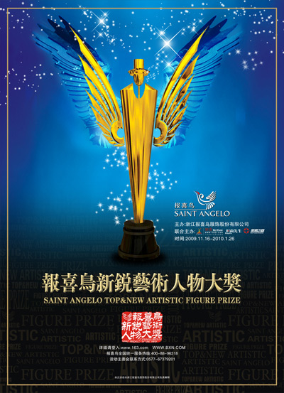 报喜鸟2009新锐艺术人物大奖评选活动从2009年11月初开始进入海选阶段,评选委员会将通过终端选拔和网络选拔等形式,选出40位获得新锐艺术人物提名奖(每个版块10名),这40位年轻新锐艺术家将于明年1月26日汇聚北京,等待大奖最终的揭晓。