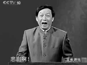 此外,在2008年底到2009年初之间,易中天教授在一期《百家讲坛》中说了一句“悲剧啊”,这张截图随后在各大论坛中如喜剧般逗引着人们的笑神经,也是“悲剧”一词迅速流行的重要原因。