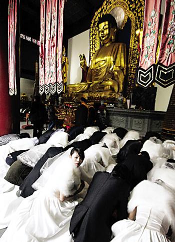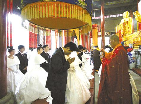 网友解读:这些新人全是佛教徒吗?还穿着西装、婚纱拜佛祖?不洋不土,真怪!