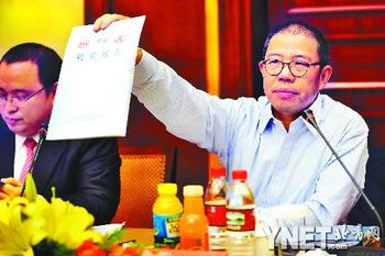 农夫山泉董事长钟睒睒昨表示对复检“不予认同”。图为11月30日钟睒睒展示有关部门的检验报告-供图/新华