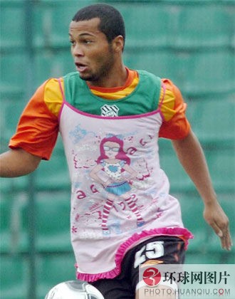 如果你是一名主教练的话,你会怎样惩罚那些在训练中表现不佳的球员?是冲他们吼叫,踢他们屁股,还是让他在比赛中坐冷板凳 ?巴西乙级球队费古埃伦斯主帅罗伯托-费尔南德斯给出了他的答案——让球员穿着吊带衫继续训练!先中招的是中场球员贾伊 洛,在球衣和训练背心外面,贾伊洛不得不套上一一件粉红色的吊带衫,胸前的卡通女孩形象煞是可爱。要不是贾伊洛形象过于彪悍,也许 会有人以为这是哪个小保姆在开辟第二职业……