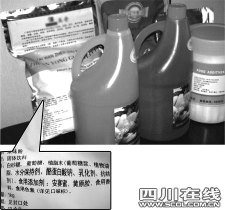 据了解,在成都的一些农贸市场有制作勾兑豆浆、花生浆、核桃奶、果汁的各种添加剂售卖,其配料为葡萄糖、麦芽糊精、白糖、黄原胶、瓜尔豆胶、抗结剂、着色剂等,惟独没有花生。但即便是这样,一些商家为了招揽生意还声称很多酒楼、火锅店都在自己这里的定点拿货。
