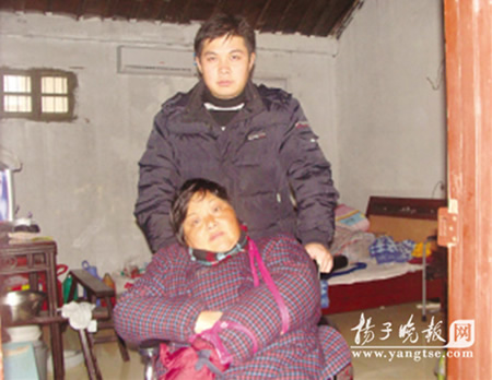 昨天,记者在兴化市昭阳镇西霞社区的一间民房里见到了这对患难母子。母亲徐美华,是原兴化市气筒厂退休职工;儿子刘永权,2008年从清华大学美术学院艺术设计专业毕业。记者看到,民房内设施简陋,但其中一副全新的残疾轮椅和一张马桶椅分外惹眼。瘫坐在轮椅上的徐美华动情地说,她家本住在三楼,儿子为方便她出门晒太阳租下了这间平房,全新的残疾轮椅和马桶椅是儿子专门请人为她“量身定做”的。