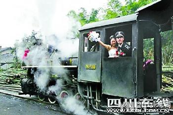 12日清晨,犍为县嘉阳小火车石溪火车站,一列小火车像往常一样缓缓开出。绸花、彩带、气球……装饰一新的小火车显得喜气洋洋。在这里,以前都是火车司机当“配角”,见证新人的婚礼,这一回,作为新郎官的杨光华成了主角——他开着小火车,迎娶回了自己的新娘。杨光华也成为第一位包犍为县小火车专列的新人。在铁路边长大的杨光华,小时候的愿望是成为一名小火车司机。直到今年8月,杨光华终于如愿以偿,当上了小火车司机。