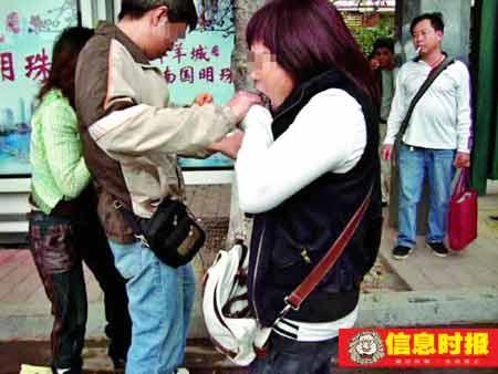 做老公的见此情景,忙用身子挡在“小三”前面,并大声说:“你干什么?你敢再打她试试看。”中年妇女不肯相让,抓住其老公的领带,拼了命似地继续发动攻击。不久,男子脸部被打成淤青,情妇也被打得眼泪直流,紧紧地从后面抱住男子腰部。可中年妇女依然不依不饶,在毫无退路的情况下,男子猛然挣脱其老婆的束缚,带着“小三”迅速逃走了。此时,寒风夹着微雨,公交车站点没几个人,哭泣着的中年妇女,孤独地站在大街上。(记者 黄廷首)