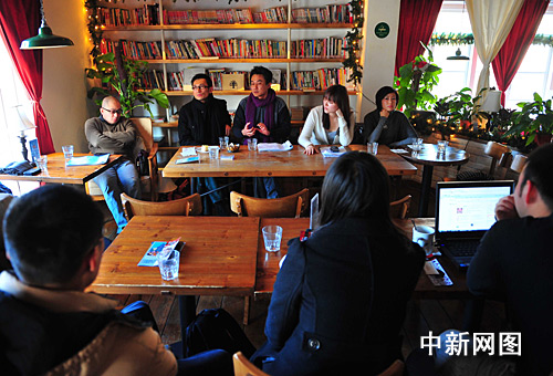 中新网12月21日电 12月20日良宵剧组在雕刻时光咖啡馆与众多戏剧爱好者进行了座谈活动。座谈会上《良宵》剧组的演员朗诵剧本片断。剧组成员还与戏剧发烧友一起为小剧场话剧把脉。