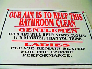 洗手间:我们的目标是保持清洁。 男士们,你们的瞄准会很有帮助。站近一些,比你想像的要短。 女士们,请在整个过程中保持坐姿。