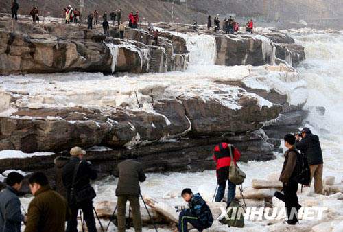 由于今冬气温偏高,位于晋陕交界处的黄河壶口瀑布至今尚未封冻,奔腾的河水与河道两岸的冰凌景观相映成景,吸引了众多游人和摄影爱好者前来观赏、拍照。新华社发(薛俊 摄)