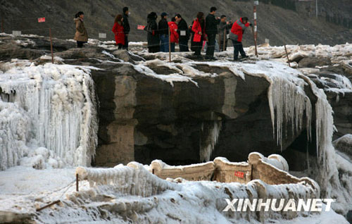 1月2日,游人在黄河壶口瀑布景区游玩拍照。新华社发(薛俊 摄)