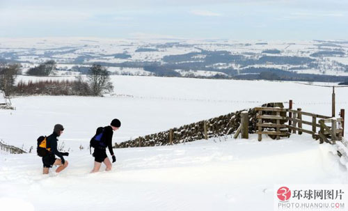 诺森伯兰郡,两名跑步者穿着短裤勇敢的在雪地中行进。