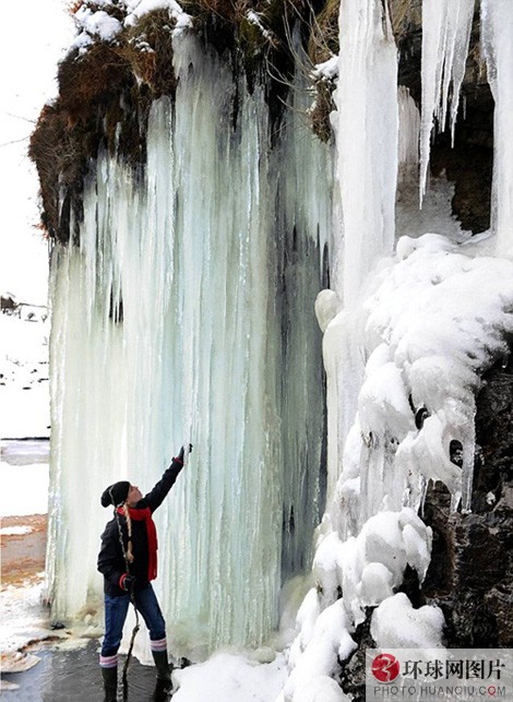 照片拍摄于坎布里亚的特斯戴尔,一名行人正用手触摸一面巨大的冰柱墙。