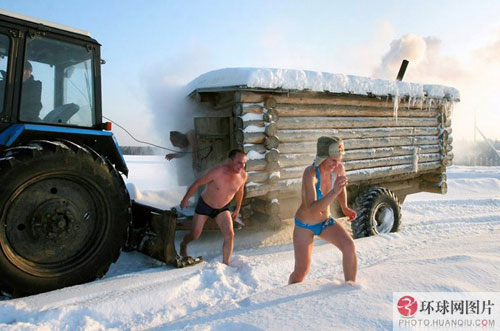 12月27日,在俄罗斯鄂木斯克市以北大约400公里的博布罗夫卡村,刚刚从一个移动桑拿房里出来的人们来到雪地里玩耍。