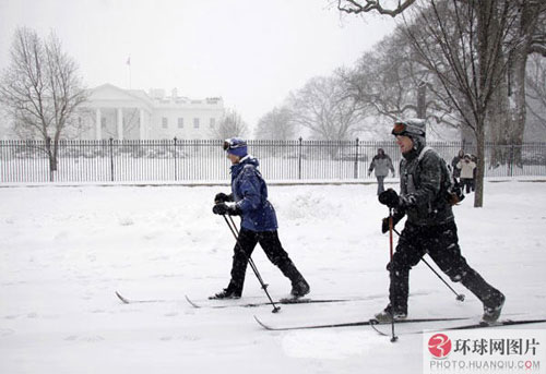 12月19日,在美国首都华盛顿,杰伊·卡尔森与林恩·卡尔森在白宫门前滑雪。