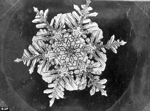 最近有一组关于雪花的摄影作品在纽约被拍卖,据悉这些照片是人类第一次用相机拍摄到的,约在120多年前。这些有开拓意义的照片一共十张,摄制者威尔逊·本特利是美国农民,人称“雪花本特利”。在美国古董展上,每张照片售价4,800美元。第一张成功拍摄到的雪花晶体照片是本特利在1885年完成,当时他年仅19岁,此后他总共拍摄了5000多张雪花照片。