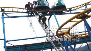 游客们被困位置较高,且悬空,靠攀援难以到达。由于游客们都拴有保险带,暂时没有生命危险。副中队长戈涛立即组织战士们架好15米长的金属拉梯,并在中间加上支架进行固定,对被困人员进行营救。1个多小时后,在中队战士的护送下,4名被困人员被成功救出,其中包括一名不满3岁的小孩。其余3人由过山车的工作人员成功救出。