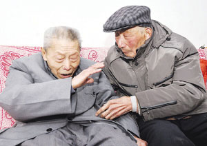 “舅舅,新年好,祝您身体健康,万事如意!”朱文国在众人搀扶下,当着舅舅吴东的面说出了准备已久的新年贺辞。鲜花、蜂胶、脑白金……一份份年货传递着,现场溢满了亲情。这二老的关系可没搞错,虽说吴东是舅舅,但确确实实比亲外甥朱文国小两岁,舅甥关系一点都不含糊。