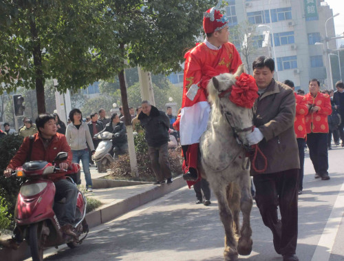 昨日,一场别致的复古婚礼在芙蓉区嘉雨路上演,新郎没有像其他年轻人用豪华车队迎娶新娘,而是骑着高头白马抬着大红花轿,把新娘子娶回家。