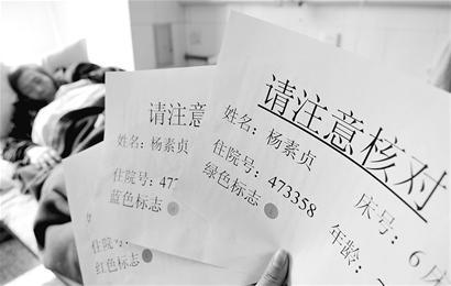 成都市二医院肾病内科在24小时内收治了3位同名同姓的婆婆,医生护士都被搞晕了,家属探望病人时,看到病床上躺的不是自己的亲人。为避免出错,医院制定了一系列措施,特意将病床卡换成了A4纸,注明了3个病人的床号、姓名、住院号,还有醒目的颜色标记。