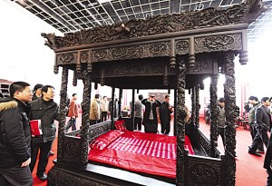 婚博会开幕之前,号称天下第一婚床的800万大叶紫檀红木龙凤床就引发市民好奇。800万元的床究竟有何门道?昨天,翘首以盼的市民终于见识到了800万的红木婚床的庐山真面目。