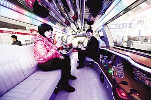 昨天的婚博会上,一辆12米长的纯白色加长林肯“领航员”婚车闪亮登场,吸引不少顾客试乘体验。记者坐进去看到,车内高度不是很高,新娘进去要俯首,但车内液晶电视、高级洋酒、时尚吧台、各色杯具、高级音响、幻彩顶灯,应有尽有,与其说是上了车,坐定了倒更像是坐在某星级酒店的大堂吧里,车内进深很宽敞,便于摄像师捕捉新人“幸福难忘的一刻”。