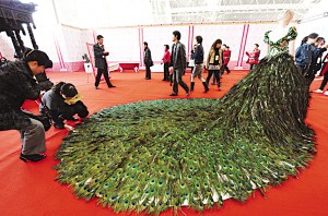 “这件中国风的礼服真别致,时尚大气一点都不土。”市民曹小姐看准台上的礼服拼命按下快门。她告诉记者,自己五月就要当新娘,至今还没选好礼服。“婚礼上肯定要准备几套衣服,婚纱不能少,传统的中式喜服我觉得太土,不想穿。”来到婚博会现场,曹小姐大开眼界——原来中式喜服还可以设计得这么时尚!