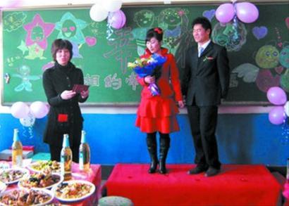 为弥补没有婚礼的遗憾,学校帮助一对“80后”老师在学校的教室举行了婚礼。婚车队是学校老师们的私家车,婚宴菜是老师们从饭店端来的,婚礼礼堂是学校的大队部,整个婚礼只花了2000多元。