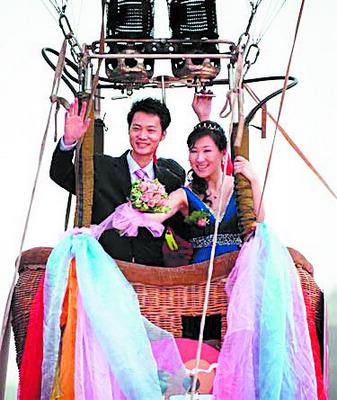 空中,热气球上的一对新人激动万分。“让蓝天作证,白云陪伴,鸟儿祝福吧,奕,我会爱你到永远。”当热气球升至近50米高空时,新郎郑重地对新娘许下了誓言,紧接着,他们彼此交换了戒指。
