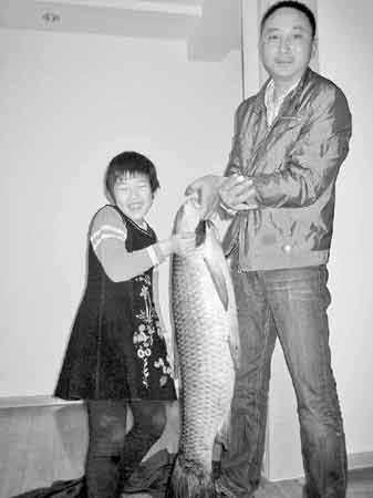 鱼是拖上了岸,可是这么大的鱼怎么弄回家呢,潘先生一家犯了愁。“后来还是我老婆聪明,从汽车的后备箱里找来一块大蓝布,我用布把鱼一包,像个大包裹一样往肩上一放,硬生生扛到车上带回来的。”潘先生笑着说道。