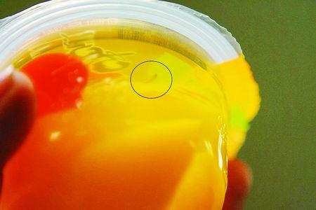 昨日,记者见到仝女士购买的200克喜之郎什锦果肉果冻,超市机打小票上显示价格为3元。果冻是圆形透明的包装壳,外膜上显示生产日期为2010年3月23日,产地为南京。仔细观察,果冻杯内接近上表面的位置,一只约1厘米长的虫子清晰可见,身体白色,头部为黑色。