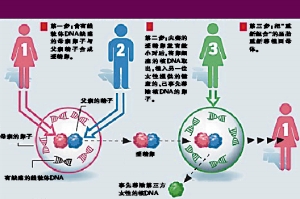 纽卡斯尔大学的科学家发现了用健康遗传物质更换有缺陷DNA的办法,从而制造出免受疾病困扰的胚胎。首先,他们需要一对夫妻的受精卵发育,并在受精卵发育仅几个小时的时候将卵细胞的核DNA取出。然后再将核DNA植入另一位女性提供的健康的、已事先移除核DNA的卵子中,继续发育为胚胎。最后,这个胚胎理论上说便有三位父母——两个母亲、一个父亲。国际台