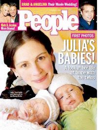 茱莉娅·罗伯茨:自从“大嘴美女”生下了一对双胞胎后,她就在远离好莱坞的私人农场中安心守着这一对宝贝。茱莉娅大部分的时间都在陪孩子们玩,她可以一天只睡四五个小时,而且从来不觉得累。茱莉娅说:“他们俩个最爱在地上爬来爬去,为了让他们爬得更为顺畅,我把家里的大部分家具都搬走了,有时候我也跟他们一起爬,我觉得这是我最快乐的时光。”