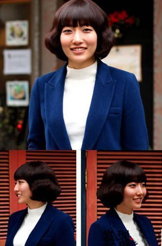 这款发型设计是蓬松的鲍勃头发型,平齐的刘海,显得可爱甜美,这款造型与这位胖脸MM搭配得非常完美,是胖脸MM不得不选的一款造型呢!