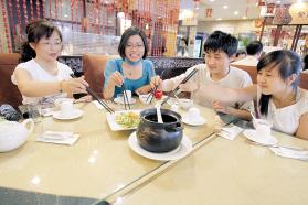 “锄草”(左二)和三位饭友一起共进晚餐 本报记者 王强 摄