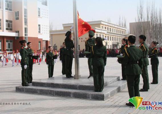 当同心中学国旗班队员们第一次穿上军装,手举鲜艳的五星红旗,迈着整齐的步伐出现在升旗仪式上的时候,全校师生投来惊讶的目光与久久不息的热烈掌声。曹永祺,用一个多月的时间,放弃午休与晚饭时间组建了阿合奇县唯一一所中学的国旗班。