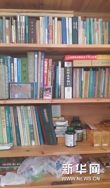 李保国家的书柜,除了摆放整齐的书,就是一盒盒的药。1998年重度糖尿病,2007年重度疲劳性心脏病,越来越重的疾病并没有让李保国放缓奔忙的脚步。“拼将一死酬知己,剪红裁绿任由之”,李保国多年摆放在书柜里的卡片上有这样两行字,格外醒目。图为李保国家的书柜。新华网记者 张雪花 摄
