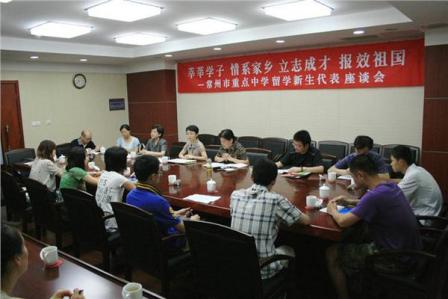 中新网8月30日电 据常州市侨办消息,为进一步涵养侨务资源,实现常州市人才强市的战略目标,近日,常州市侨办在行政中心召开“莘莘学子、情系家乡、立志成才、报效祖国”留学新生代表座谈会。部分留学新生代表和学生家长、常州教育国际交流中心、环亚西文外语培训学校和部分重点中学负责人出席会议。