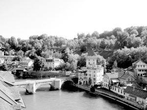 我们的大巴在清澈的阿勒河边老城区的街口停了下来。阿勒河像界河一般将伯尔尼划分成新旧两城。就在我们驻足欣赏河边绿树丛中万点红的屋宇美景时,猛听游伴大呼:“看呢,熊!”随着她指向抬头仰望,见一头黑色的熊(是标本?)正在空中的钢丝上作走钢丝状站立着,“伯尔尼”即“熊”的意思,呵呵,显见它就是伯尔尼的实体名片了。我很好奇,一座城市为何要以“熊”来命名呢?原来,该城市的创建者伯赤脱德·冯伯爵是个打猎爱好者,他说他要把打到的第一头动物来命名城市,结果那天猎到的第一头就是熊!