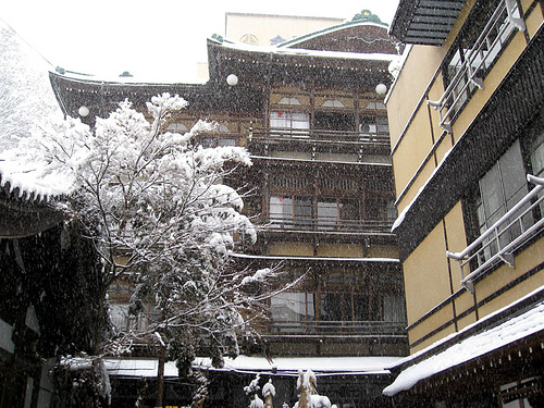 5年前曾经跟《新旅行》主编孙占涛一行住过涩温泉,当时的旅馆叫“金具屋”。后来他在杂志上做了一个专集,起名《日本涩温泉“春光乍现”》,其中有一段如下:“我们住的是旅馆的主楼,称作齐月楼。倚山而建的齐月楼其实并不很高。但可能因为小街太窄,仰首望时显得分外恢宏陡峭,让人联想到恒山悬空寺。它虽然是70年前才翻修重建的,旅店却始自1758年,至今经营了二百多年,故而楼里满是老温泉旅馆的神韵——木梁木柱木地板,走廊和楼梯蜿蜒曲折的伸向未知的去处,古雅的汤池里溢出的温热气息荡漾在四周橘色的灯光中、掩映出魔幻的气氛——刚进去我便恍惚了时间空间,似乎要变作达利笔下溶化的钟表。”