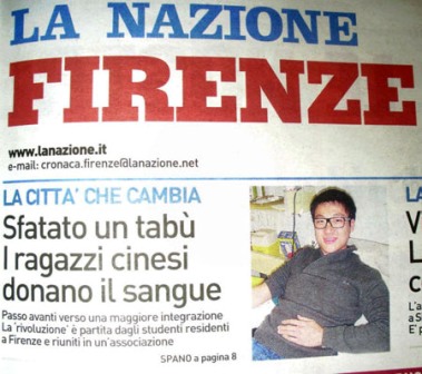 意大利主流媒体民族报(LA NAZIONE)在中国留学生无偿献血后,在头版显要位置率先发表意大利媒体界资深著名评论员乔瓦尼-斯帕诺的文章,文章以“一项禁忌被打破,中国人开始献血,”来称颂中国留学生为意大利社会所做出的贡献,称赞中国留学生为华人社会带了一个好头。乔瓦尼在文章中说,本次中国留学生的献血活动,象征着华人向融入意大利主流社会迈进了一大步,并且是特别有意义的一大步。