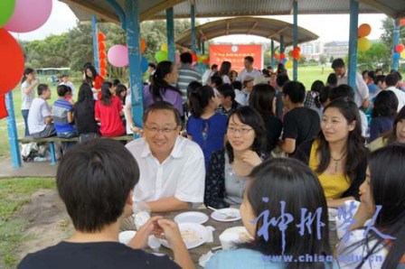活动结束前,白刚参赞和留学生、访问学者们在葱郁的绿树和如茵的绿草中合影留念。新州中国学联代表新州全体公派留学人员祝我们的祖国龙腾虎跃,祝家乡的人们幸福安康!(于洋 摄影/季毛伟)