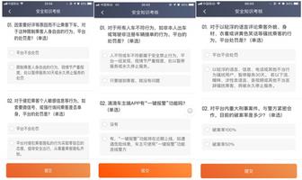 今天起持续十天,滴滴司机们每天打开车主端APP,除了要进行人脸识别外,还需要参与安全知识问答。每次考试包括两道选择题,两题均回答正确才算通过,如果两题中有一题回答错误则为考试失败,司机需要重新考试直到通过,才能正常出车。选择题内容涵盖了出行过程中的多项安全相关问题,比如滴滴安全保障制度、违反安全服务规则的处罚措施、“一键报警”等APP内安全功能的使用方式、安全驾驶规范以及如何与乘客文明友好沟通等。