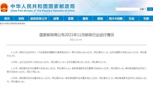 1-11月,邮政行业业务收入(不包括邮政储蓄银行直接营业收入)累计完成11628.6亿元,同比增长17.1%;业务总量累计完成12409.3亿元,同比增长26.7%。