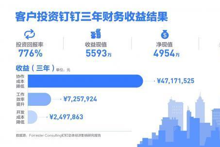 近日,全球知名咨询与研究机构Forrester咨询发布《钉钉总体经济影响™研究报告》(下称“报告”)。据报告所示,某企业启用钉钉后,应用开发成本逐年降低40%、信息获取及整合效率提升50%,企业投资回报率高达776%,企业开发和协作成本大幅降低,工作效率显著提升。