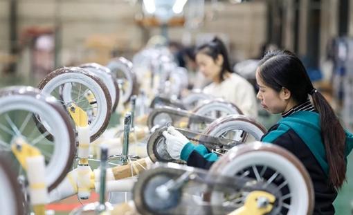 平乡一家童车企业,工人在组装自行车。柴更利 摄