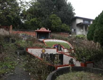 墓碑前方有小径,周遭植物错落有致,外围矮墙的北面入口竖起两扇醒目的红色铁门,中间挂着一把生锈的老锁。山下的沟仔墘老街早已不是台北、新北市民的通勤要道;由墓园远眺,车水马龙的中山高架连接起了今天的“双北”。
