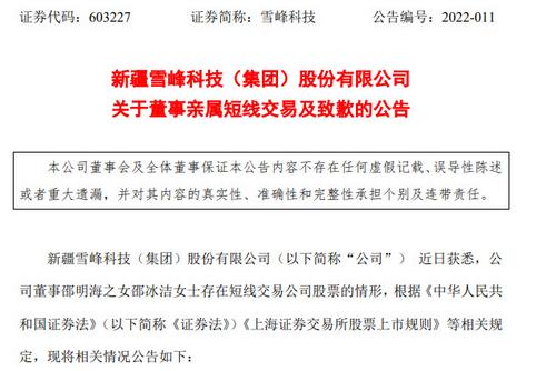 中新财经2月8日电 2月8日,新疆雪峰科技(集团)股份有限公司发布公告,称近日获悉,公司董事邵明海之女邵冰洁存在短线交易公司股票的情形。